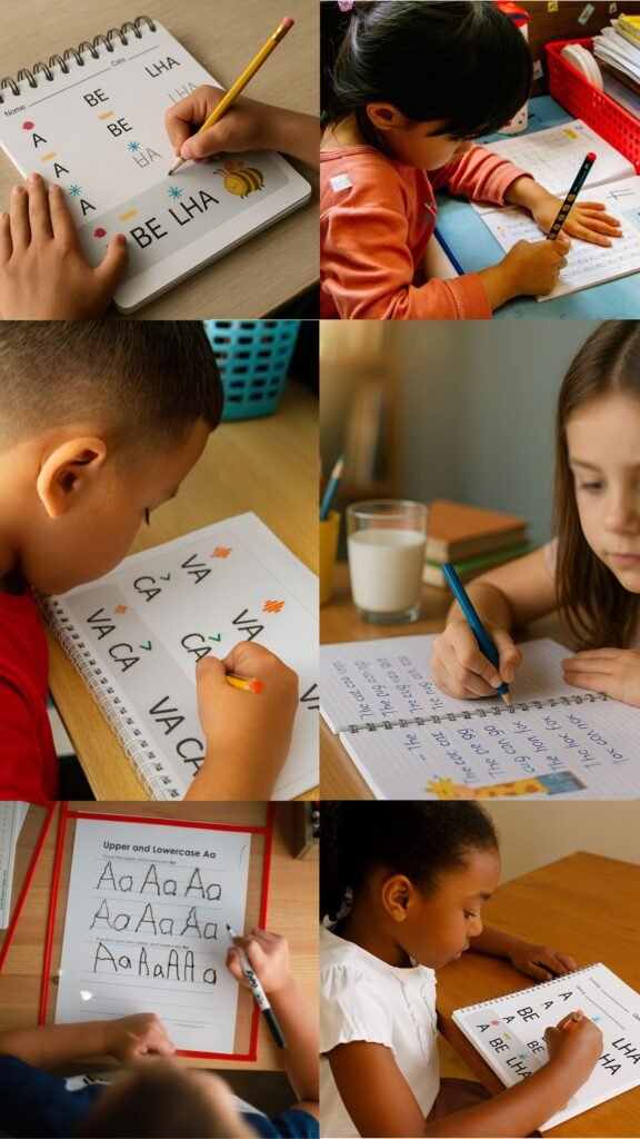 Ao traçar linhas, curvas e padrões fonéticos, ela fortalece as conexões cerebrais responsáveis pela leitura,